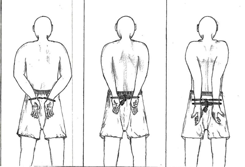 He has filed a Title 42 Section 1983 federal civil rights action. He was subjected to pain,harassment, and extreme sleep deprivation continuously from May 10, 2011 until May 18, 2011. He stated that he was strip searched and placed in "excessive restraints," including two pairs of handcuffs, a security box with a chain and padlock for the handcufss, and leg shackles. His cell was tossed and strewn about each time this happened. And, it happened 170 times in those 8 days (that's once an hour!). The black and white drawings were included in that case. The color drawings represent his account of what happens to him. The words under those drawings are his paraphrasing from the prison manual on cell extraction procedures